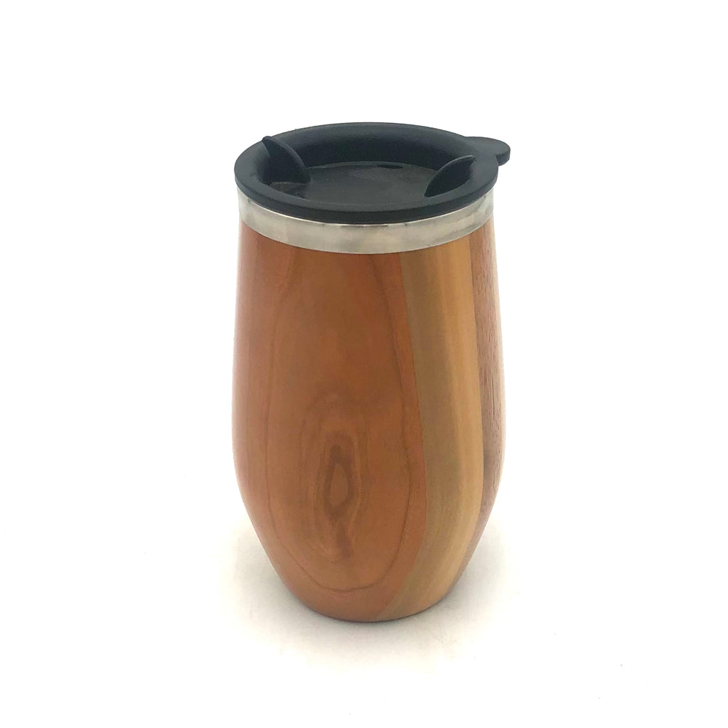 Made from Indiana hardwoods, this stemless wine cup fits well in the hand, insulating your wine while holding it. Our multi-wood cup has a 10 oz. stainless steel insert and includes the option to add a press on lid.