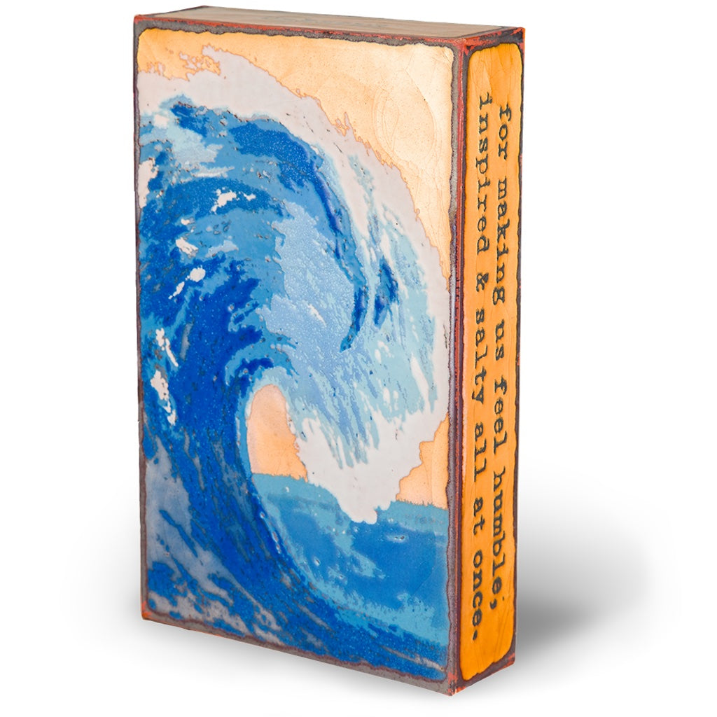 Made by hand with USA-sourced copper, glass enamel, and a custom wood box frame - akin to the size of a novel.