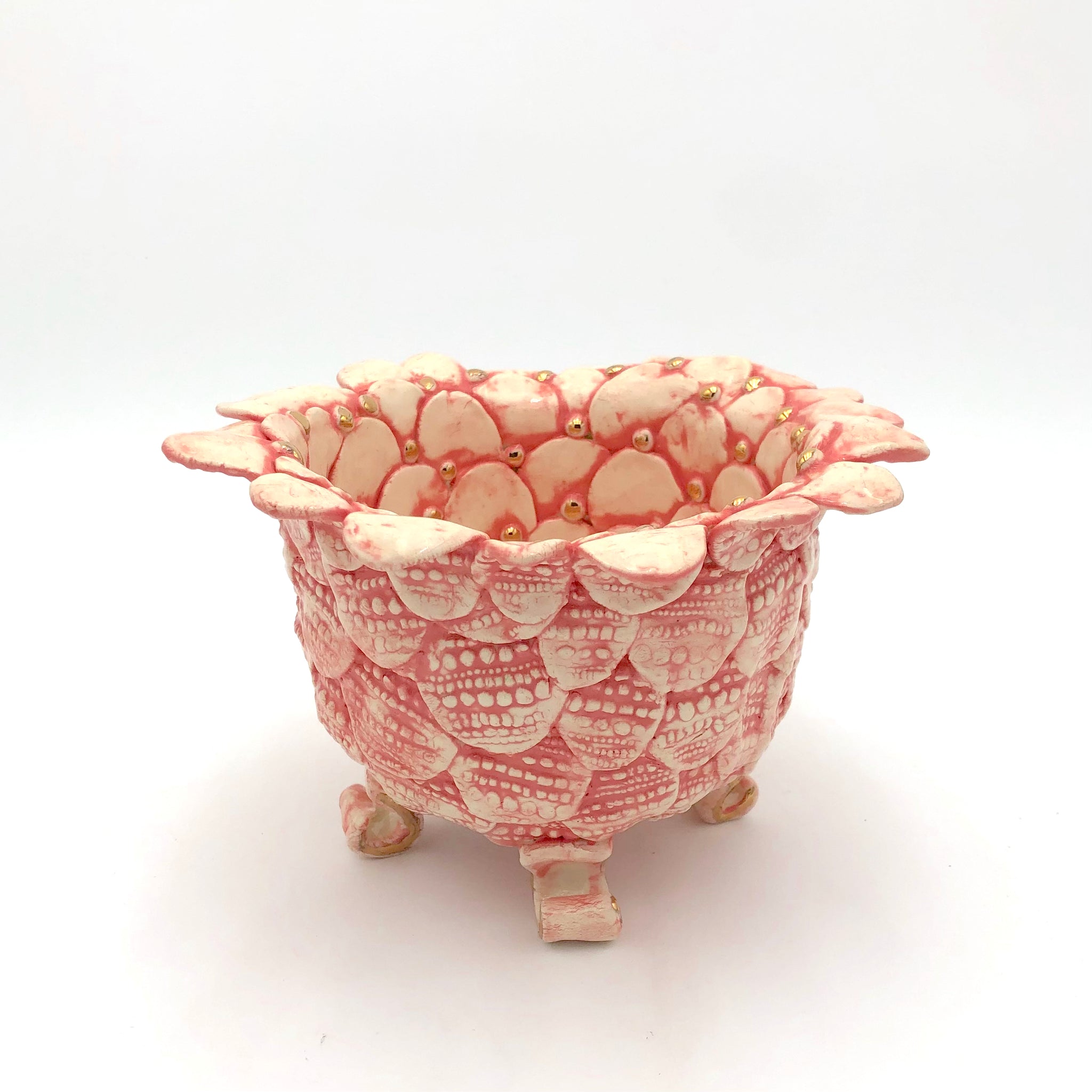 Deborah Gendel - Porcelain Ceramic Bowl - Pink & White Leaf Bowl (Gold Dots)