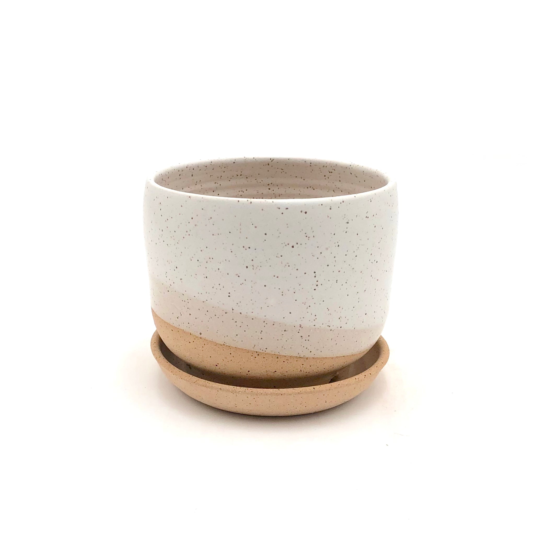 This handmade ceramic pot and saucer are made on the potter's wheel from stoneware clay and dipped twice in a warm glazes. Planters are left unglazed on the inside and finished with a drainage hole.