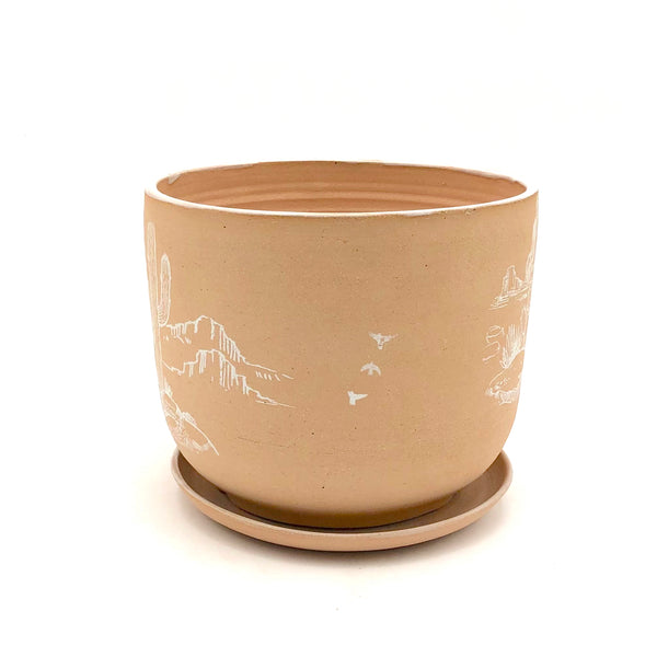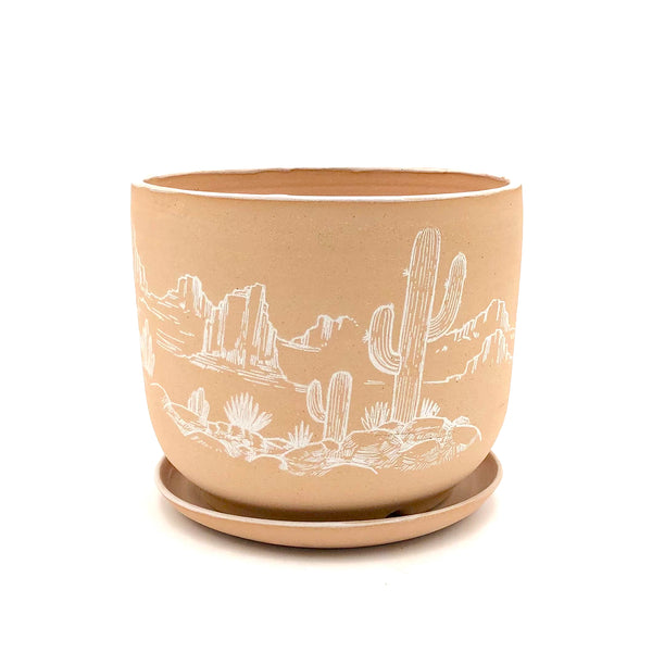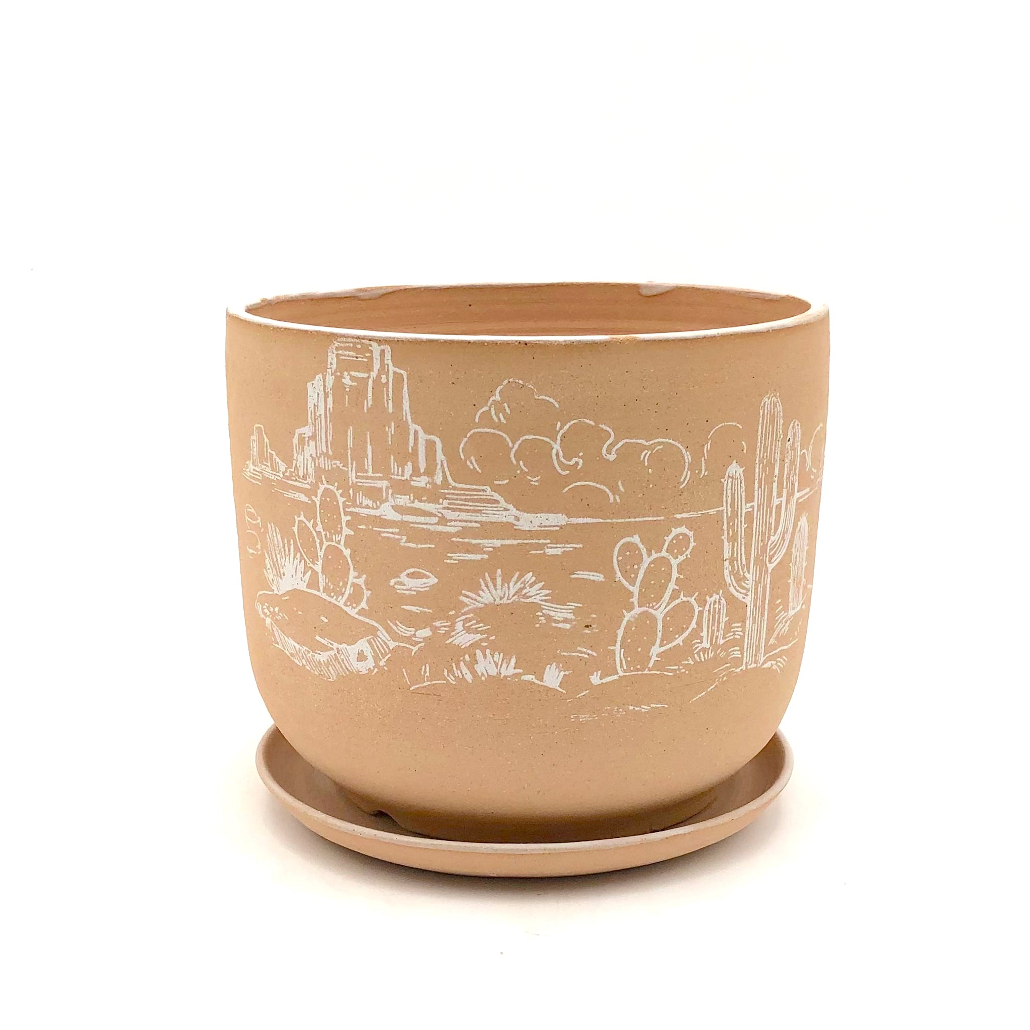 These lively, natural plant pots and saucers are made on the potter's wheel with stoneware clay and finished with a desert landscape design. Interior is left unglazed and features a hole for water drainage.