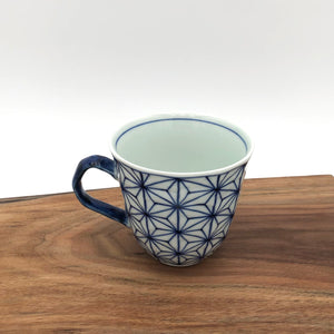 The blue asanoha design adds a cute geometric look to your morning coffee mug! Microwave and dishwasher safe.