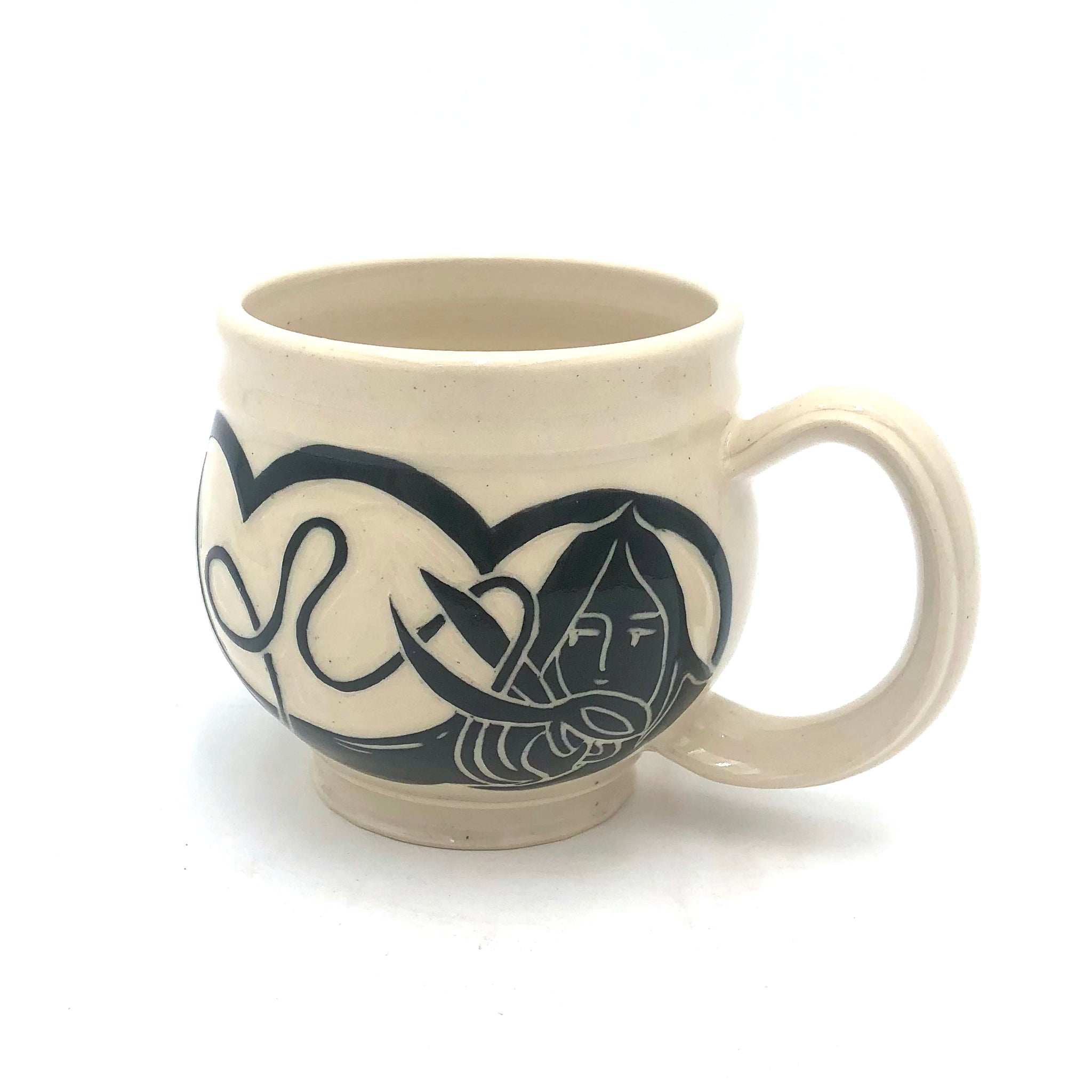 This ceramic mug features imagery of the Three Muses with their String of Fate. Carved into the surface of the clay using sgraffito.