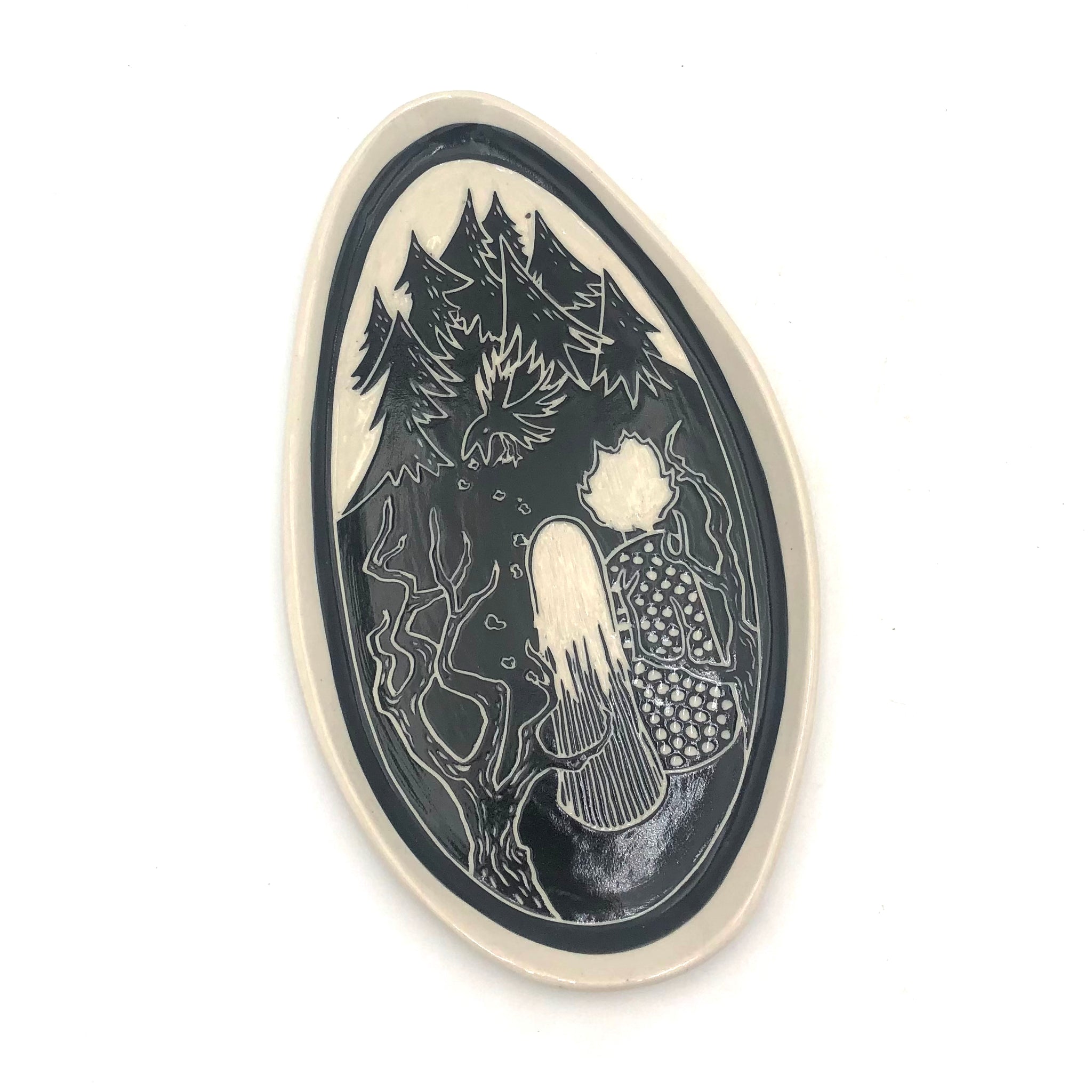 This oblong plate depicts fairytale characters Hansel and Gretel in the woods. Carved into the surface of the clay using sgraffito.